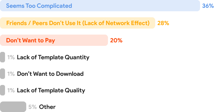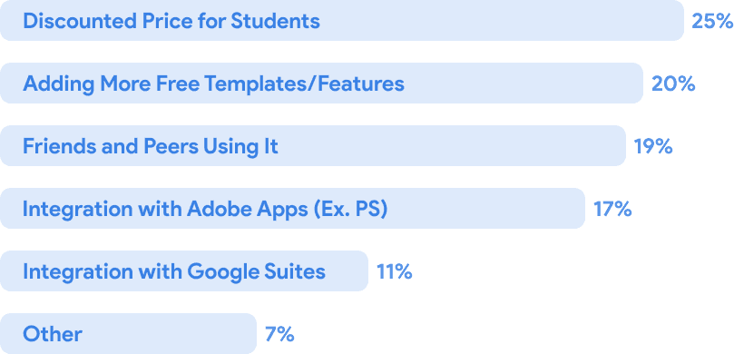 Student discounts and more templates were reported as the greatest reasons why a user would switch from their current content creation platform to a new one, targeting our future feature definition and UX analysis to highlight these two offerings.